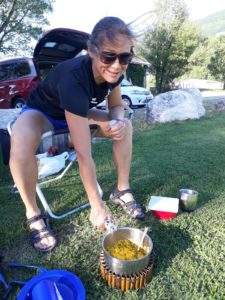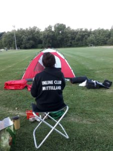 Ein wenig später fuhren wir zum Zeltplatz auf dem Fussballfeld. Als die Exoten, umzingelt von abenteuerlustigen Franzosen, kochten wir das Abendessen auf dem Benzinkocher. Unser neidischer Nachbar stocherte in einer Dose mit Katzenfutter ähnelten Inhalt. Bei schöner Abendstimmung sassen wir vor dem Zelt, genossen ein Dessert und analysierten die Strecke von morgen. Ein starker Wind wehte ununterbrochen durch die ganze Nacht. Als der Wecker um 6 Uhr früh klingelte, war uns sofort klar, dass dieser den Rückweg auf den Skates kraftraubend machen wird.