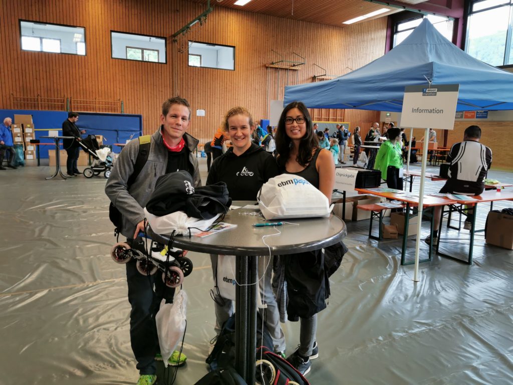 Nachdem wir die Startnummern und T-Shirts geholt hatten, platzierten wir uns in der Turnhalle bei den Tribunen. Nach einer kurzen Besprechung (Wetter war wechselhaft, teilweise war die Strecke nass und trocken), machten wir uns mit den Laufschuhen auf den Weg, um den letzten Teil der Strecke zu besichtigen. Die Temperatur war nicht so hoch. Nach einem guten Einwärmen der Muskeln besprachen wir nochmals, was für Rollen wir fahren. Zwei entschieden sich für Regenrollen und drei für Trockenrollen. Nachdem wir das geklärt hatten, gingen wir kurz Einfahren, um pünktlich am Start zu sein.